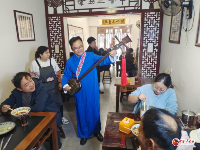 当日,北关市场内人流如注、熙熙攘攘,众多游客与市民齐聚于此,享受美味的同时观看凉州贤孝和永昌滚灯,凉州贤孝传承人贾旭峰与用餐的游客进行了互动,人们安逸地享受着这份独具凉州特色的烟火美味。