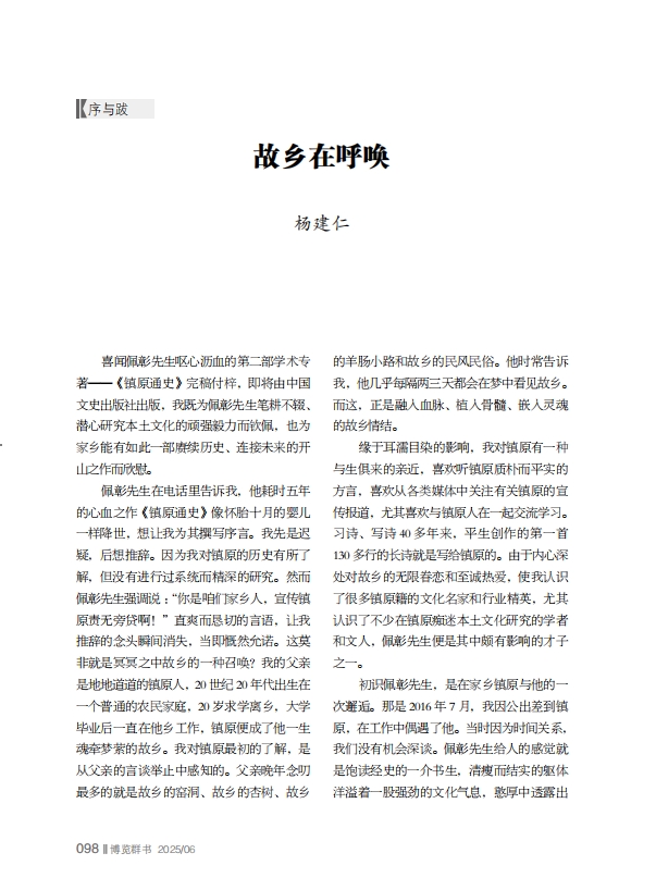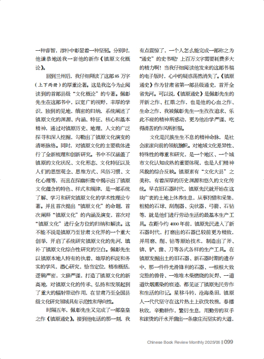 喜闻佩彰先生呕心沥血的第二部学术专著——《镇原通史》完稿付梓,即将由中国文史出版社出版,我既为佩彰先生笔耕不辍、潜心研究本土文化的顽强毅力而钦佩,也为家乡能有如此一部赓续历史、连接未来的开山之作而欣慰。